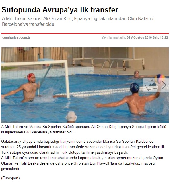 Cumhuriyet | A Milli Takım Kalecisi Ali Özcan Kılıç İspanya Ligi takımlarından Club Natacio Barcelona transfer oldu.