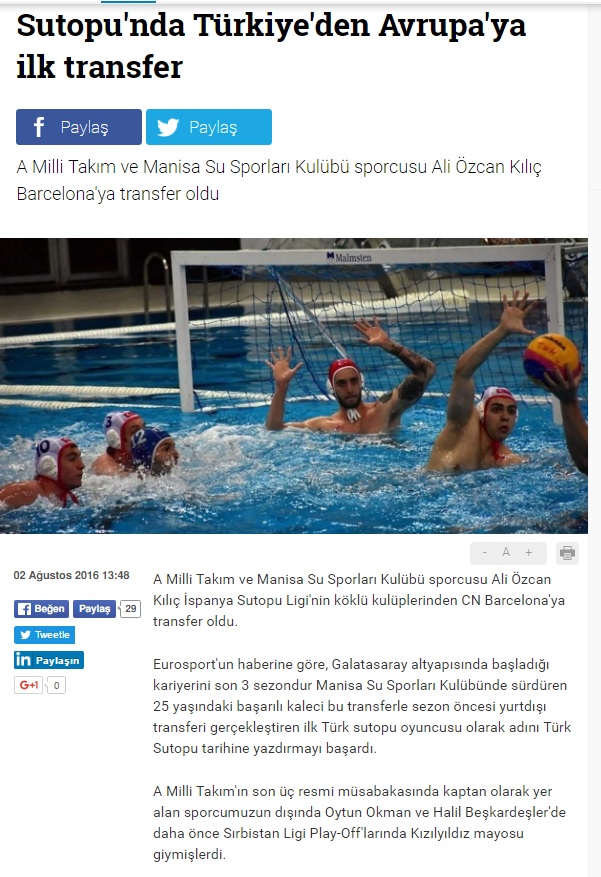 Water Polo National team and Manisa Water Sports Club goalkeeper is transferred to Barcelona.